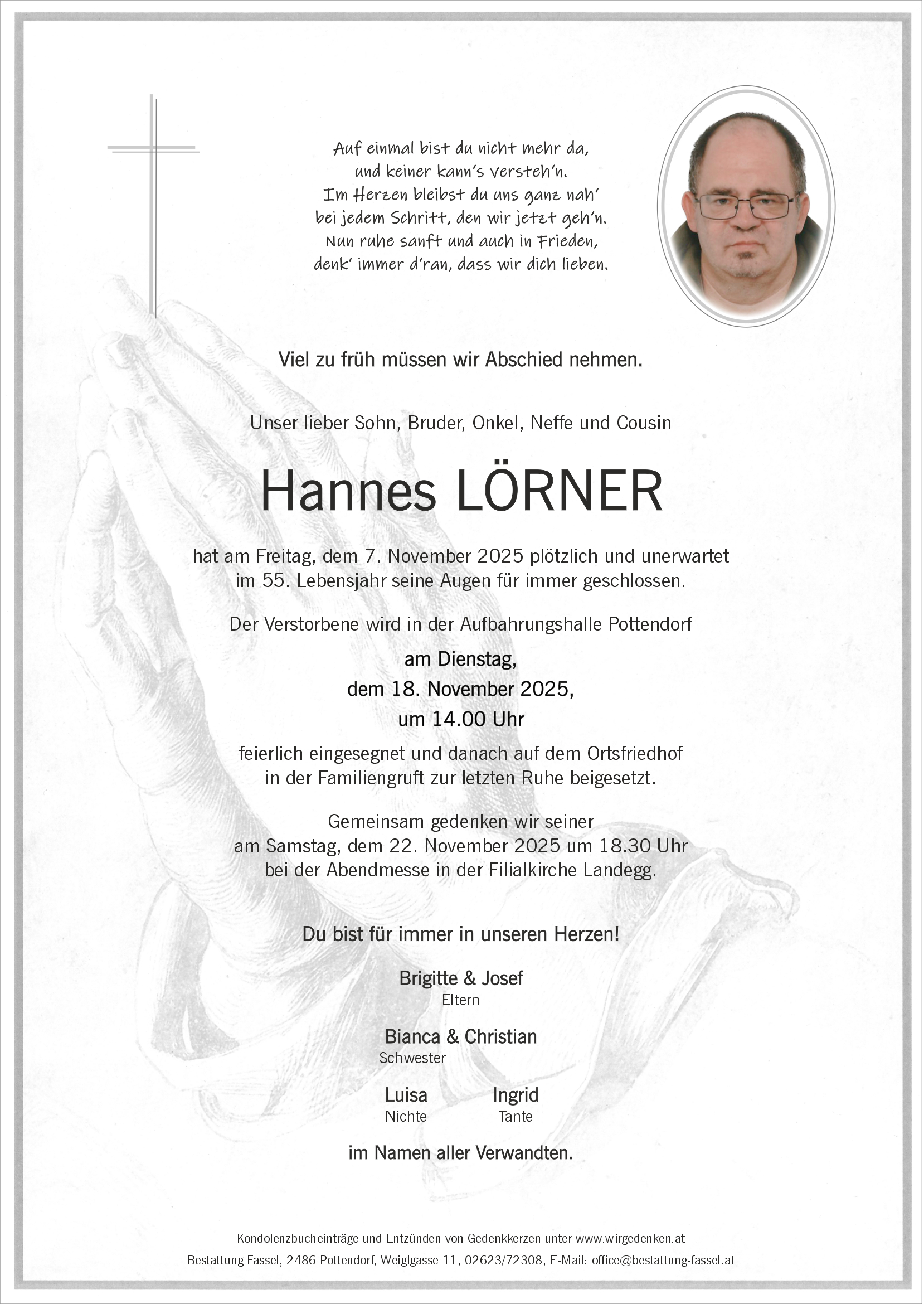 Die feierliche Einsegnung und Beisetzung findet am Dienstag, den 18. November 2025 um 14 Uhr am Friedhof von Pottendorf statt. Gemeinsam gedenken wir seiner am Samstag, den 22. November 2025 um 18.30 Uhr bei der Abendmesse in der Filialkirche von Landegg.