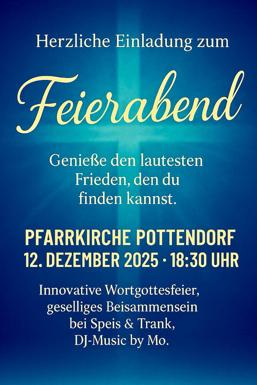 Herzliche Einladung zum "Feierabend" am 12. Dezember um 18.30 Uhr in der Pfarrkirche von Pottendorf und zum geselligem Beisammensein bei Speis und Trank.