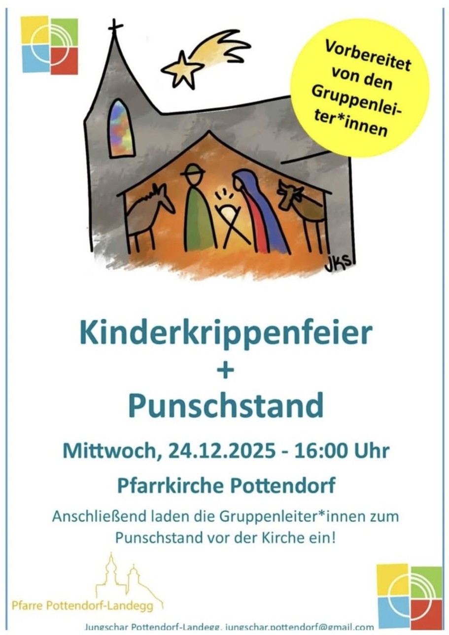Herzliche Einladung zum Krippenspiel der Jungschar am 24. Dezember 2025 um 16 Uhr in der Pfarrkirche von Pottendorf. Im Anschluss laden die Gruppenleiter*innen zum Punschstand am Kirchenvorplatz ein.