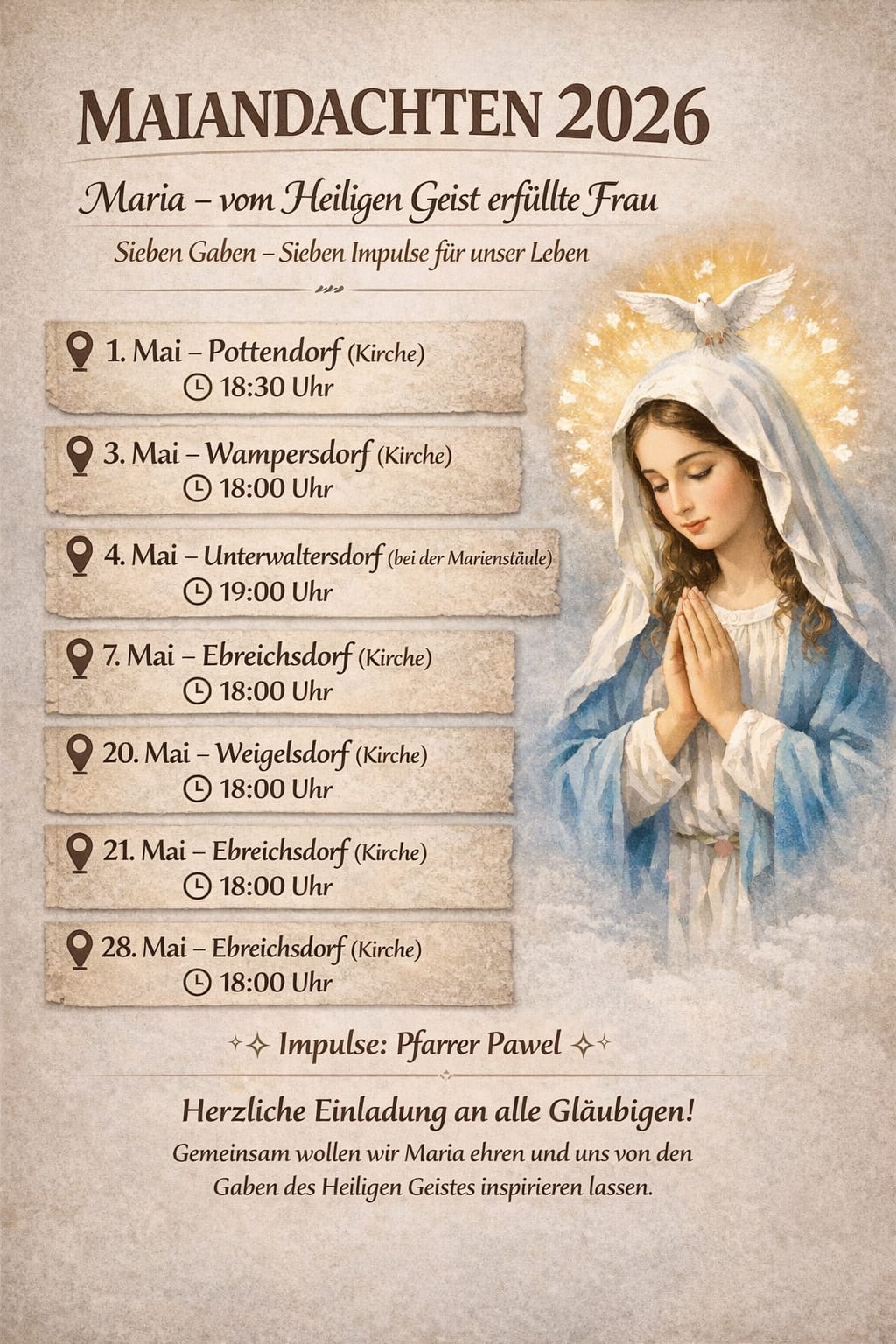 Herzliche Einladung zum 3. Feierabend am 24. April 2026 um 18.30 Uhr in der Pfarrkirche von Pottendorf und im Anschluss zum geselligen Beisammensein bei Speis und Trank.