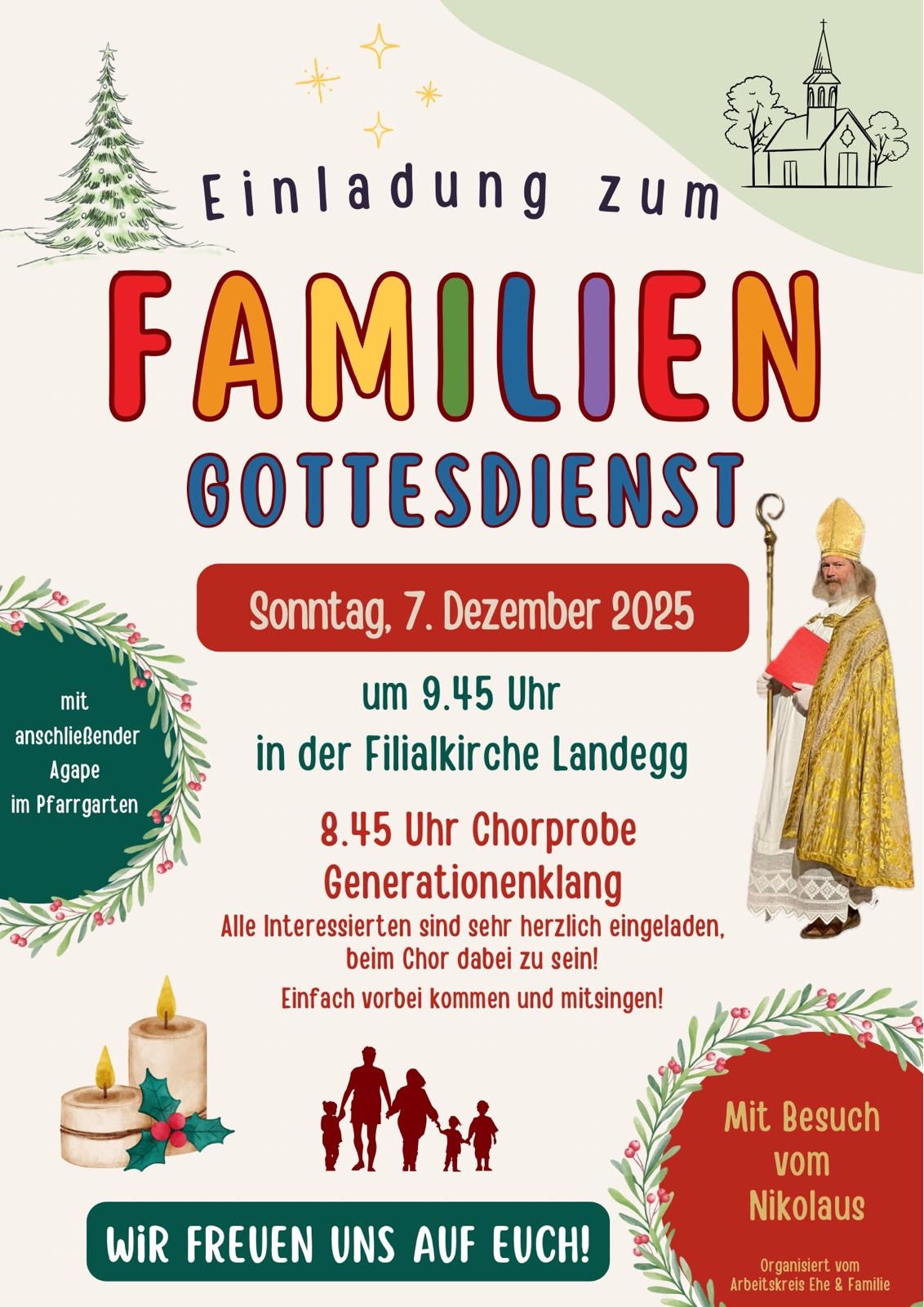Herzliche Einladung zum nächsten Familiengottesdienst am 7. Dezember 2025 um 9.45 Uhr in der Kirche von Landegg. Unser besonderer Gast in diesem Gottesdienst ist der Nikolaus.