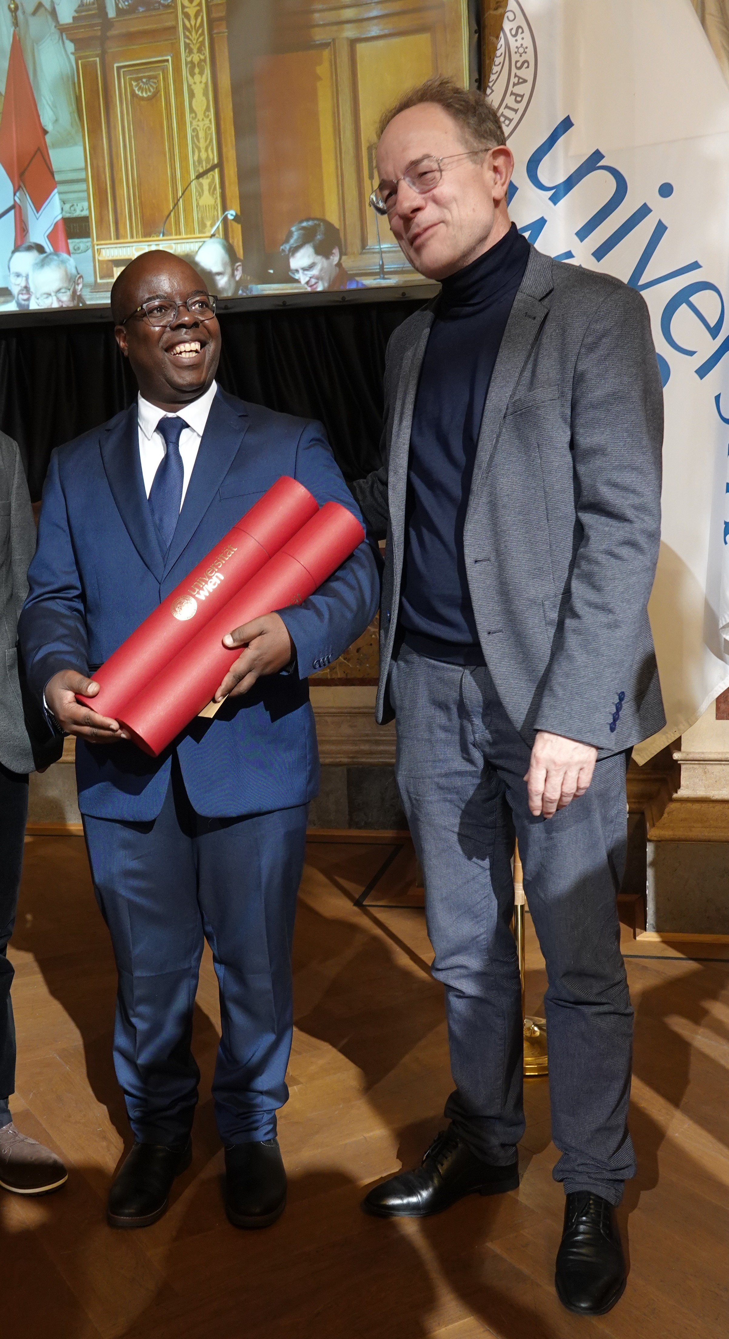 Rodgers sowie die anderen AbsolventInnen stellten sich vor und nannten den Titel ihrer Arbeit. Nach dem Gelöbnisteil erhielten die AbsolventInnen ihre Urkunden überreicht. Rodgers erhielt zwei Urkunden: eine für sein Masterstudium und eine für sein Doktorrat.