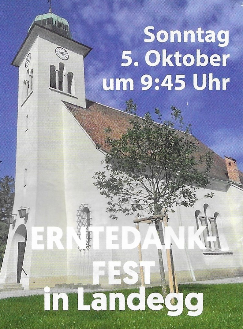 Herzliche Einladung zum Erntedankfest am 5. Oktober um 9.45 Uhr in der Kirche von Landegg. Im Anschluss an die Messe laden die Landegger Bäuerinnen und Bauern zur Agape ein.
