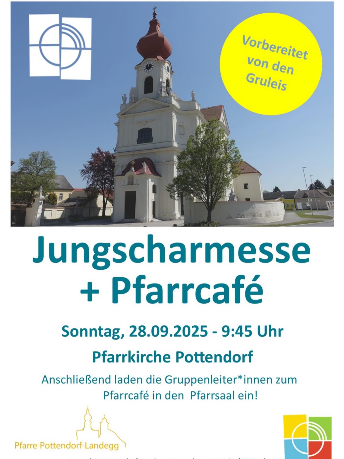 Herzliche Einladung zur Jungscharmesse am 28. September 2025 um 9.45 Uhr in unserer Pfarrkirche. Die Messe gestalten die Jungscharleiterinnen und -leiter. Anschließend ist Pfarrcafé.