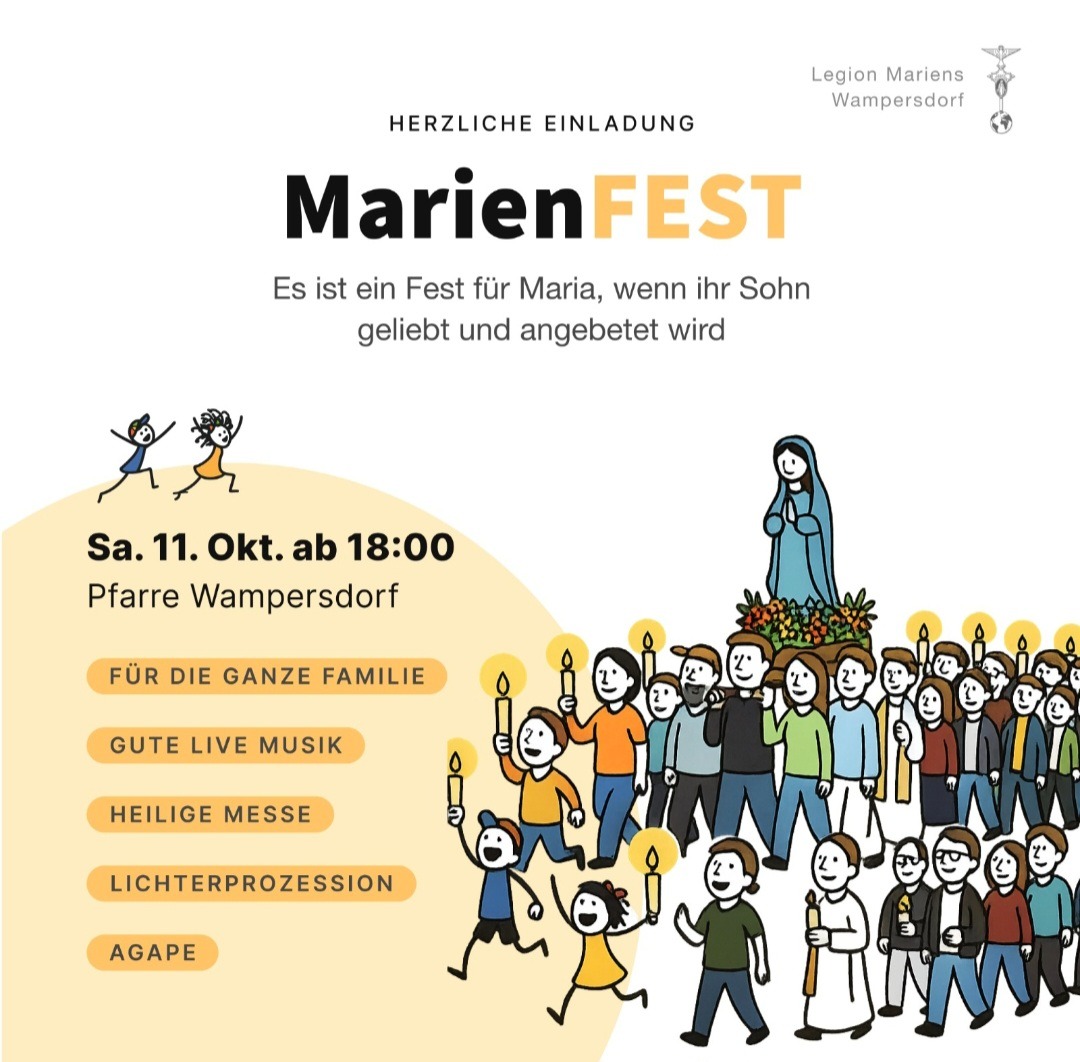 Wir laden alle am 11. Oktober 2025 um 18 Uhr recht herzlich zum Marienfest in Wampersdorf ein. Die Abendmesse wird in der Kirche von Wimpassing um 19 Uhr gefeiert. Die Vorabendmesse in Landegg am 11. Oktober entfällt!