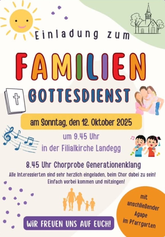 Herzliche Einladung zu unserem ersten Familiengottesdienst nach den Ferien am 12. Oktober um 9.45 Uhr in der Kirche von Landegg. Anschließend gibt es eine Agape.
