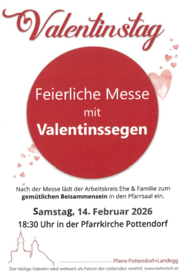 Herzliche Einladung zur Messe mit Segnung, in unserer Pfarrkirche am Samstag, den 14. Februar um 18.30 Uhr. Im Anschluss lädt der Arbeitskreis Ehe und Familie zu einem gemütlichen Beisammensein in den Pfarrsaal ein.
